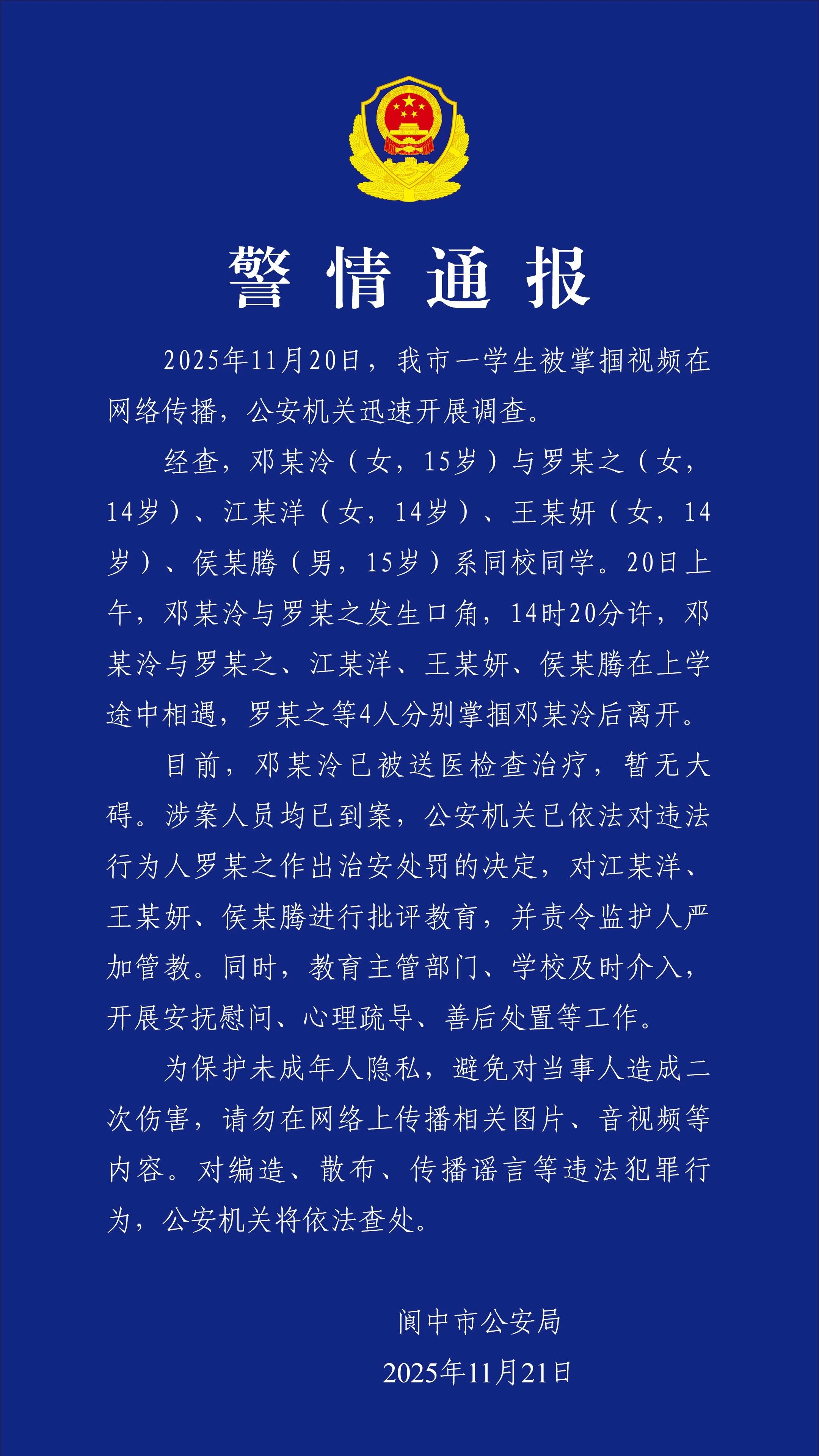 通报称,2025年11月20日,阆中一学生被掌掴视频在网络传播,公安机关迅速开展调查。